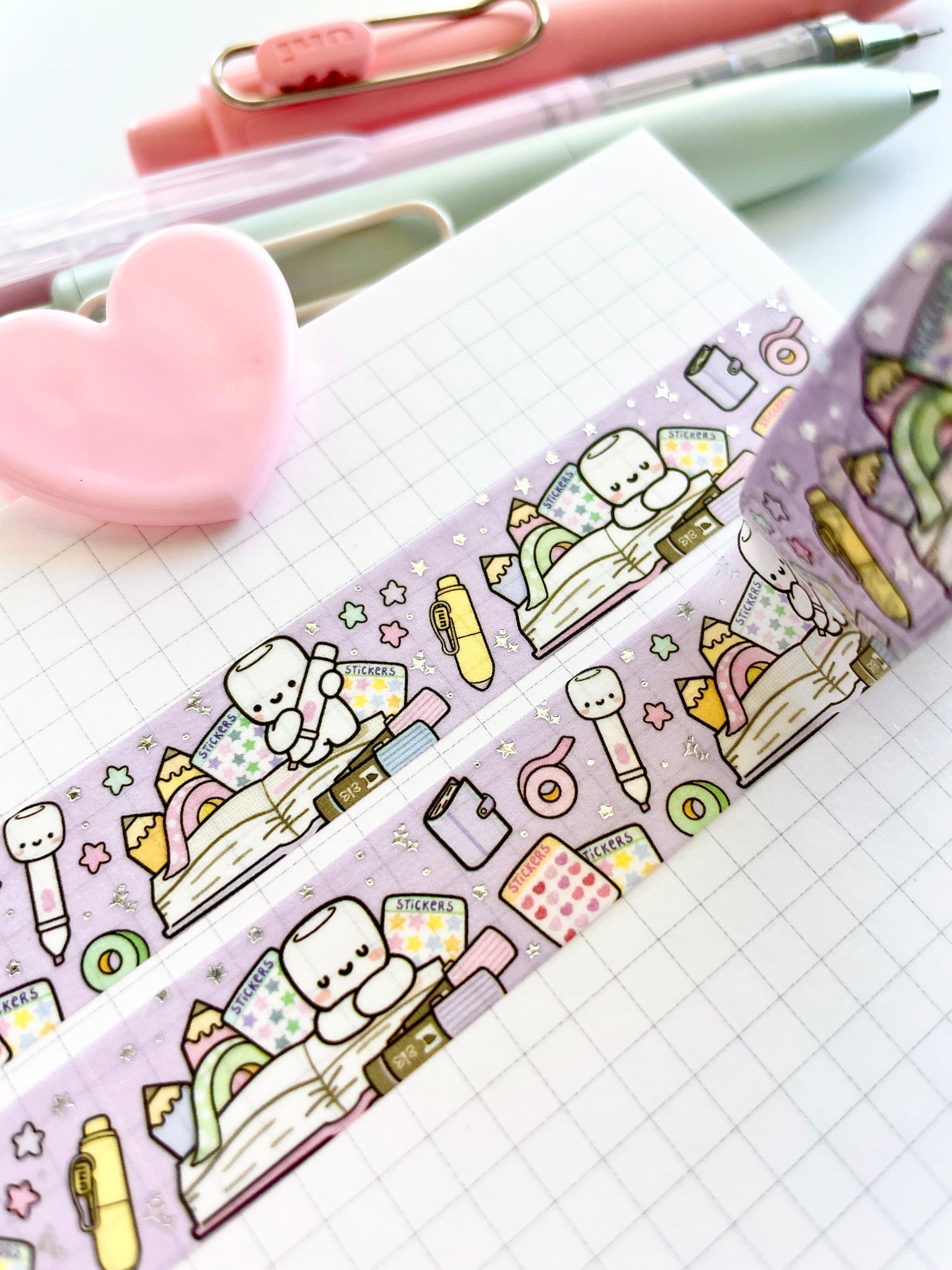A purple washi tape with Cocoa surrounded by all the stationery! the background is filled with chunky stars and silver foiled elements.