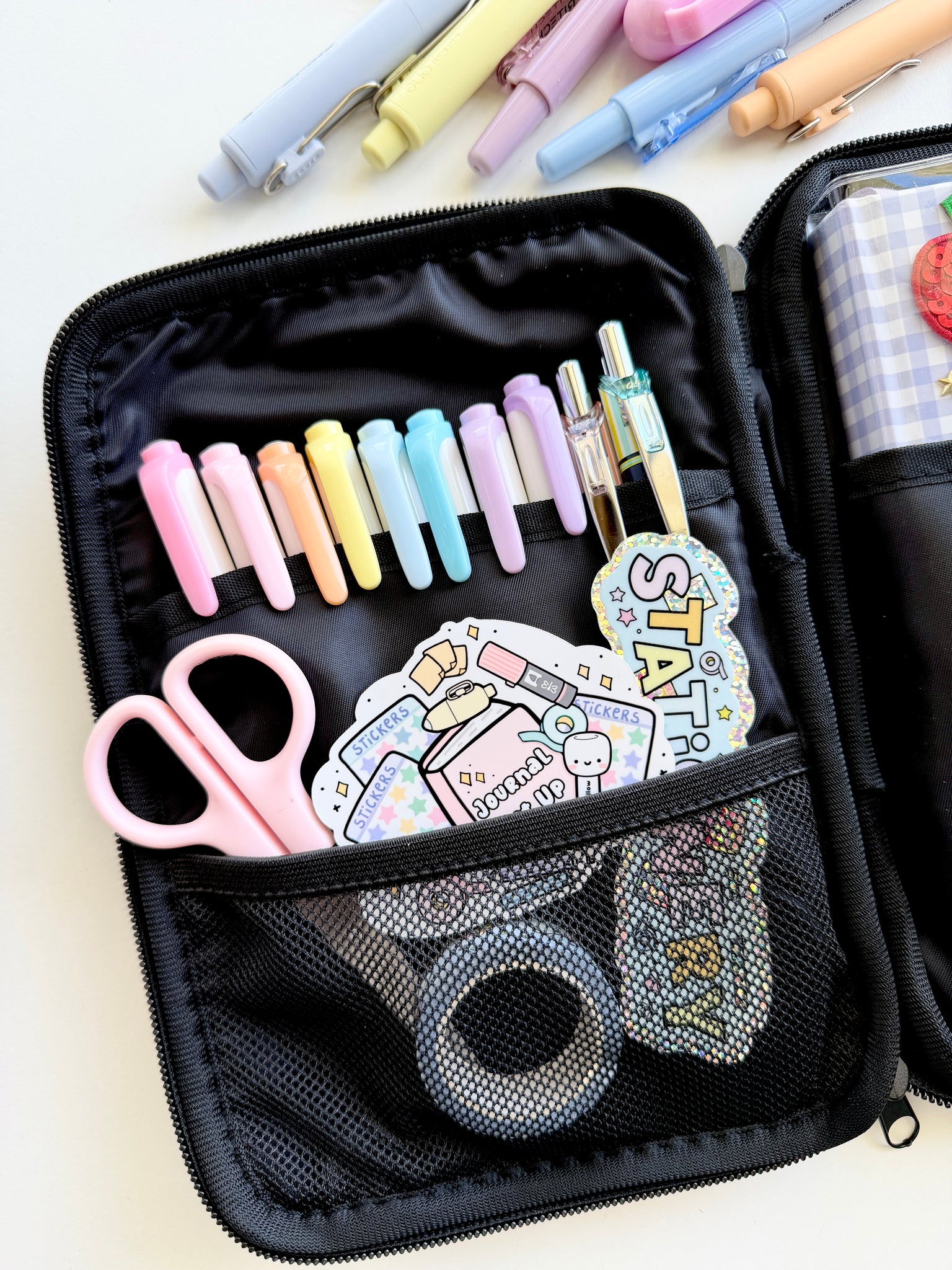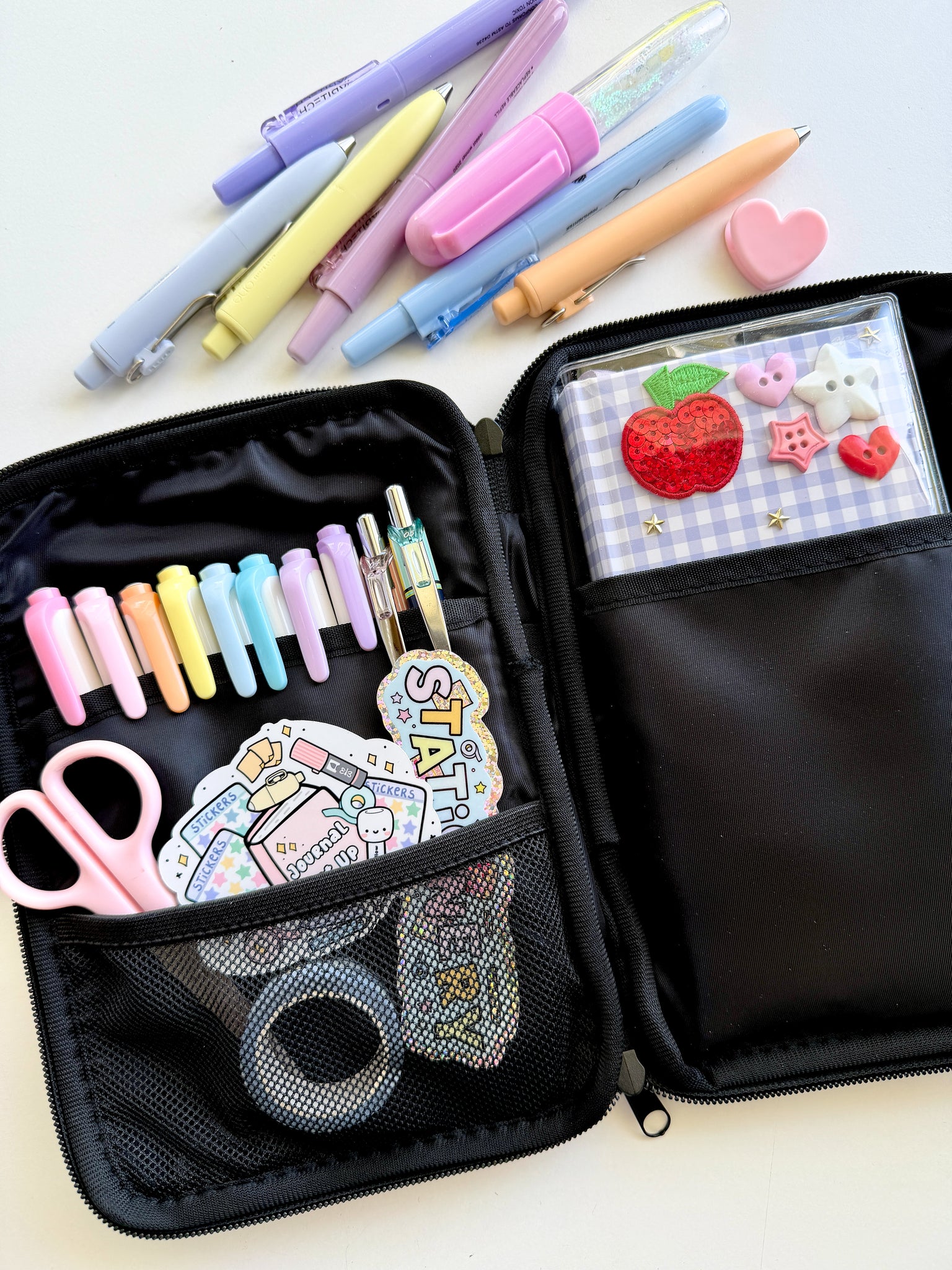 A cute little drawer pouch that is perfect for a weeks sized planner or smaller! With inner pockets to hold multiple pens and stationery items along with a half mesh pocket for extras like washi tape. Can also be used as a pen pouch and is a super handy compact carry all for notebooks + stationery :)