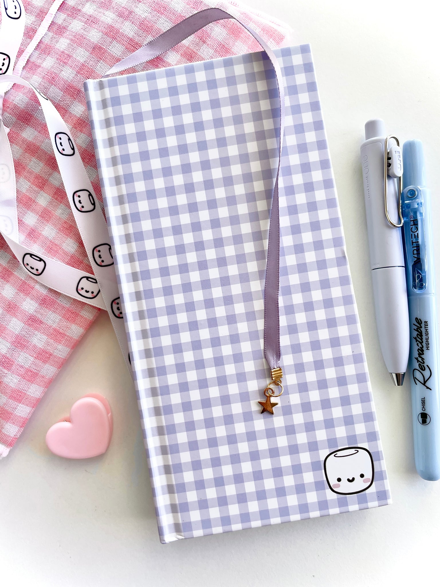 The Mini Mallow Weeks is here! A chic gingham cover design in Periwinkle (purplish blue) with lilac satin ribbon that features a gold star charm.